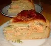 Пеку только с жирной рыбкой (семгой или форелькой), надо совсем немного, стейка одного мне хватает (если рыба крупная). Из сухой рыбы (горбуши, пикши) получается не так вкусно. Первый слой теста, на него рыба с кольцами лука, поперчить, натереть на мелкой терке тонкий слой сыра, чтоб слегка припудрить слой рыбы и закрыть вторым слоем теста. Мммм, вкусно.. Очень полезно-печеная сочная рыба, свежие овощи в салате. Но бабуля в деревне все равно пекла вкуснее, рыба свежайшая из речки (щука